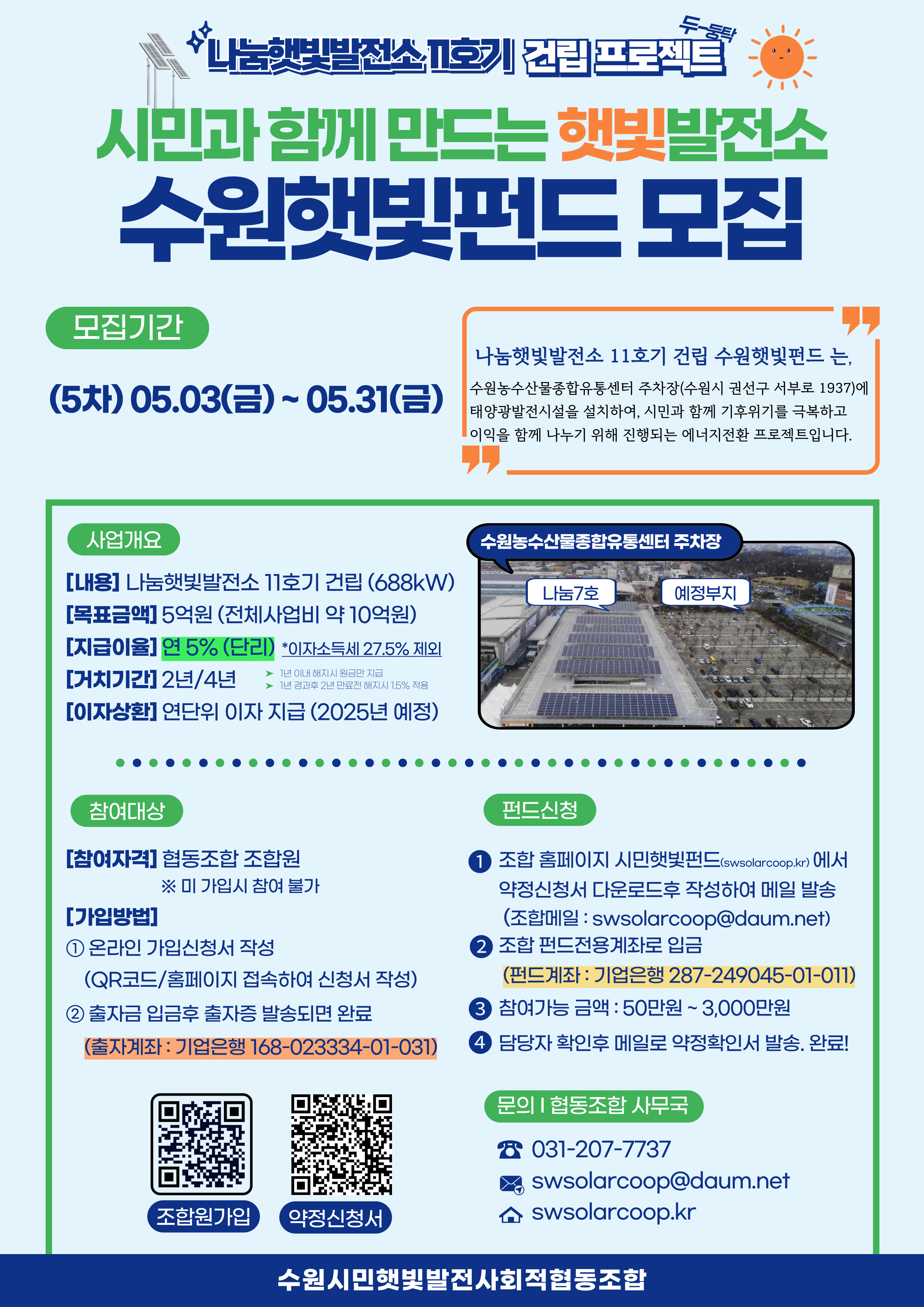 녹음이 짙어지는 5월, 나눔햇빛발전소 11호기 건립을 위한 「5차 수원햇빛펀드」모집이 5월 3일~31일까지 한달간 진행합니다.