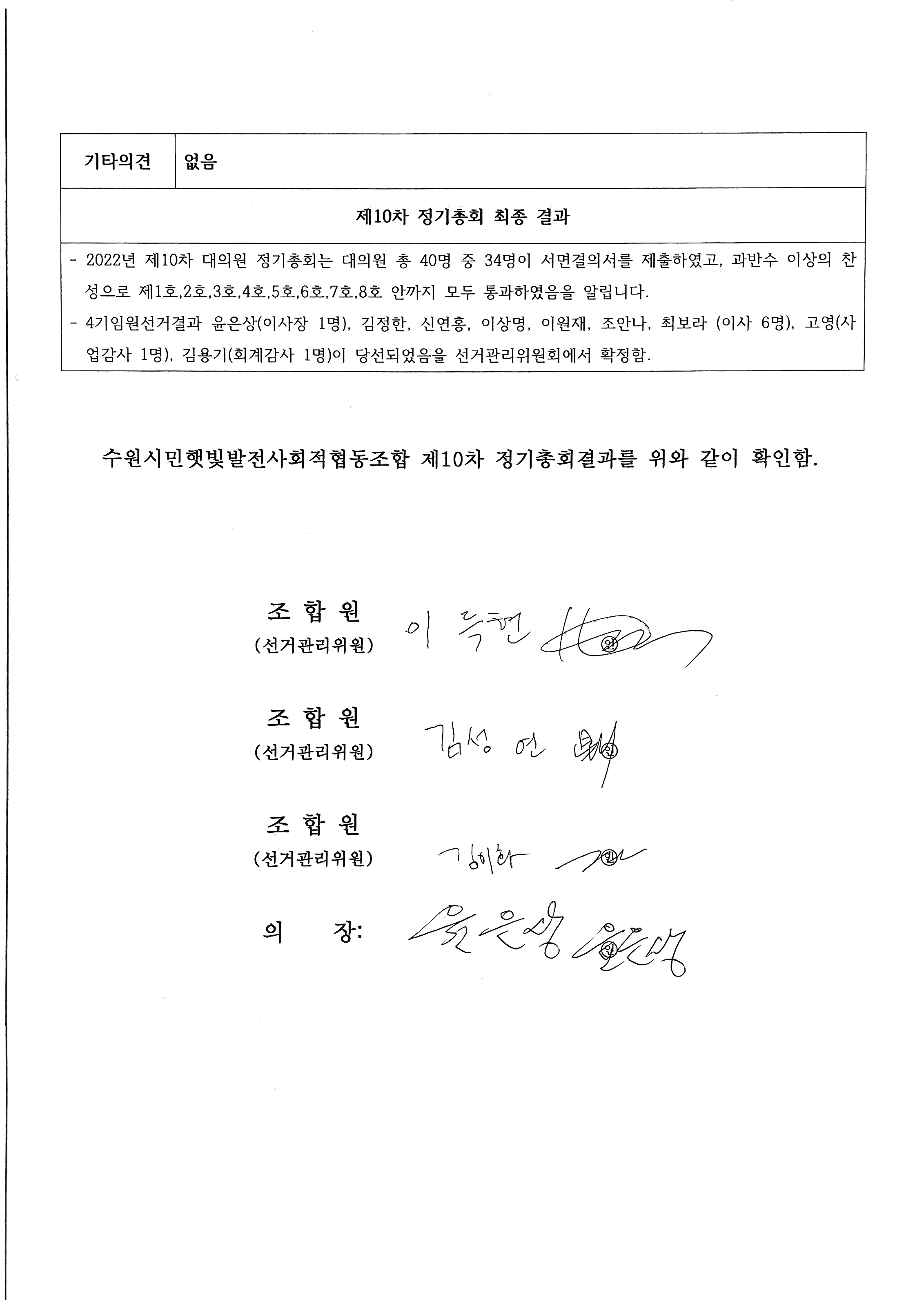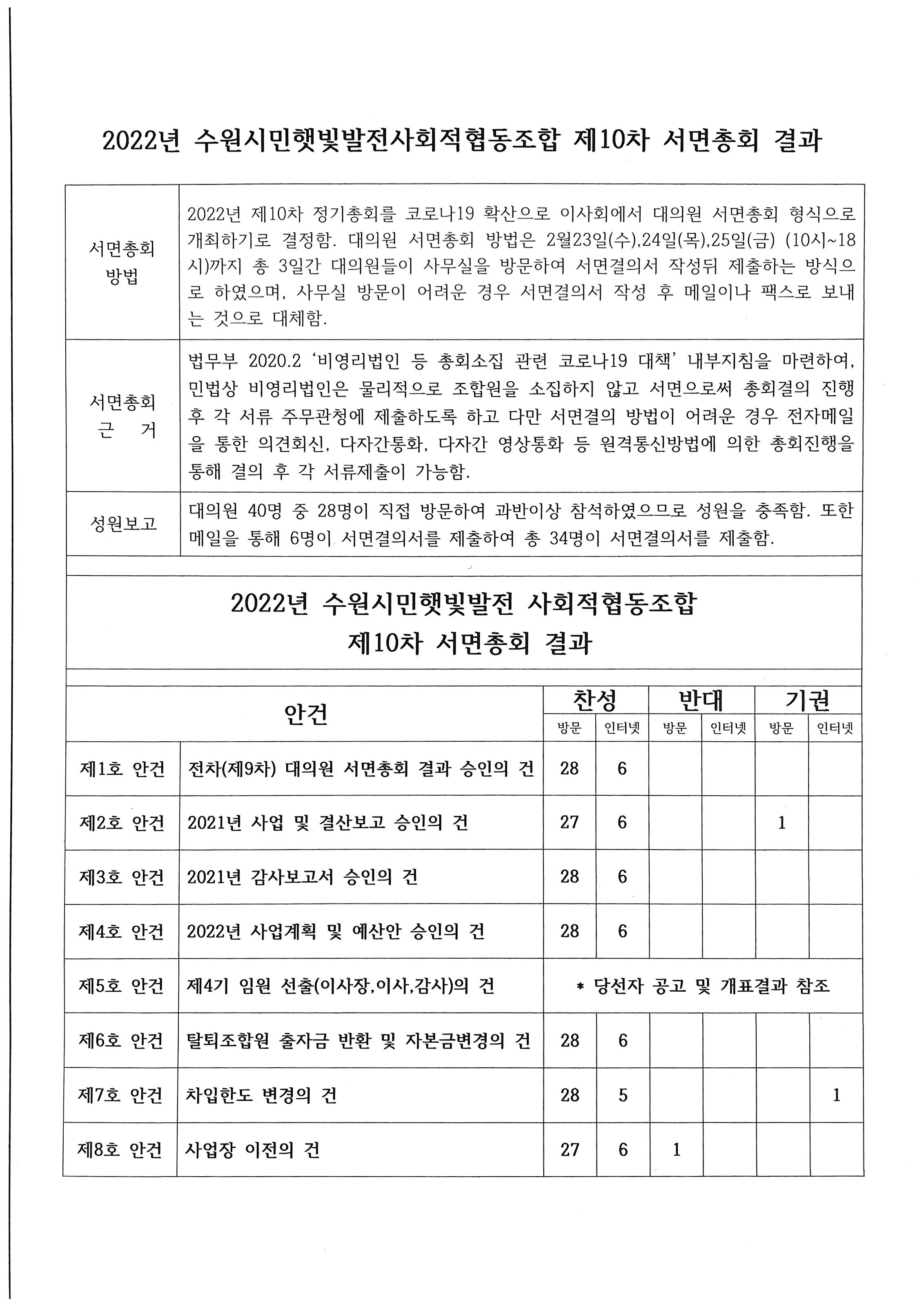 제10차 정기대의원총회(서면) 결과를 다음과 같이 공고합니다.