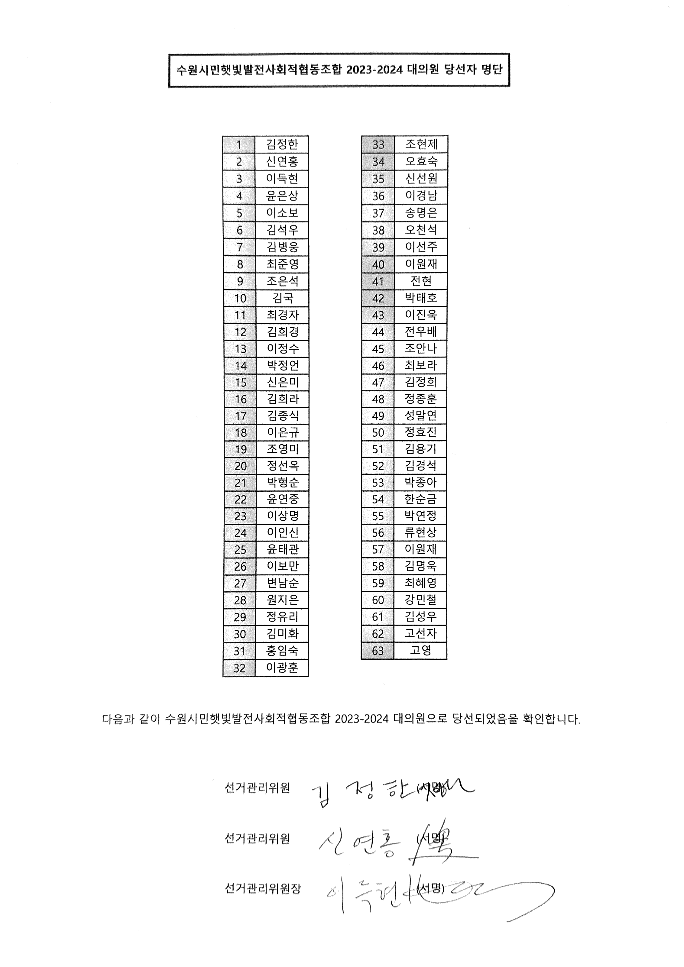 2023~2024년 2년간 임기의 대의원 선거 결과를 다음과 같이 공고합니다.