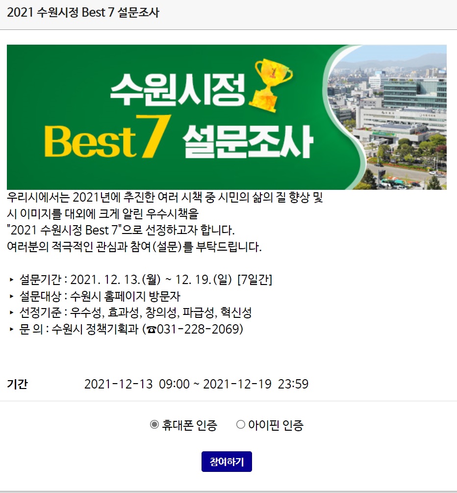 현재 수원시에서는 올 한해 수원시 행정중 가장 혁신적이고 우수한 사례에 대해 설문조사를 진행하고 있습니다.