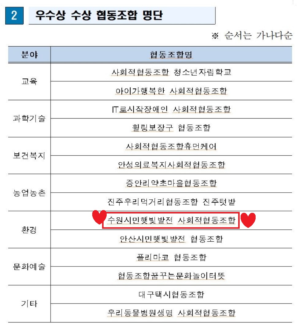협동조합기본법10주년을 기념하여 진행된 베스트협동조합어워드에서 수원햇빛이 환경부문 우수상을 수상하였습니다~!!!