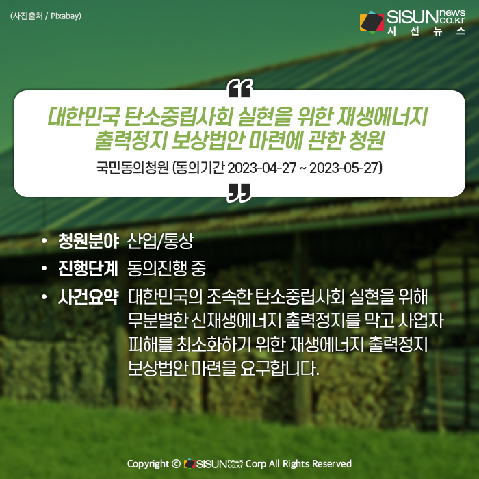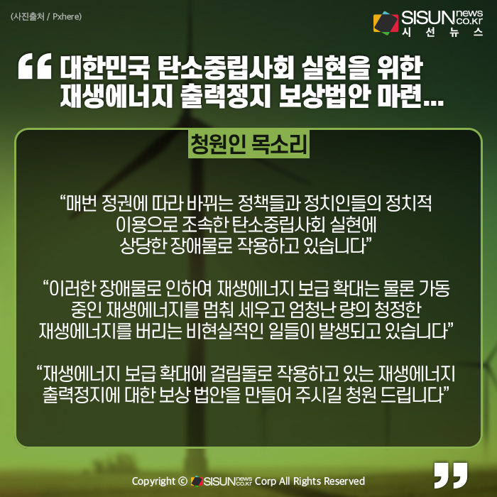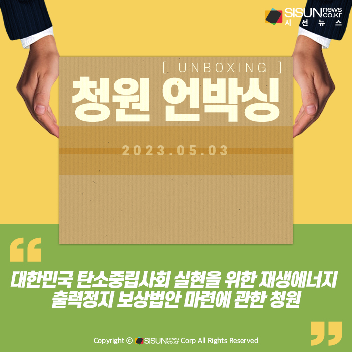 이제는 국회가 나서 대한민국의 조속한 탄소중립사회 실현과 우리 미래 세대에게 깨끗한 지구의 환경을 물려주기 위한 재생에너지 보급 확대에 걸림돌로 작용하고 있는 재생에너지 출력정지에 대한 보상 법안을 만들어 주시길 청원 드립니다.