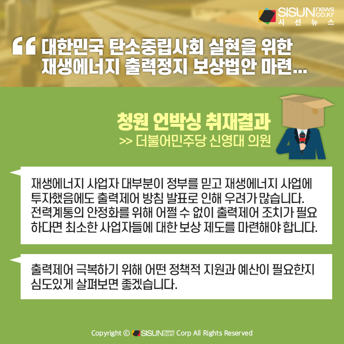 이미 재생에너지 민간사업자들은 정부의 부당한 정책 도입으로 많은 피해를 감수하고 있는 마당에 보상안 없는 무분별한 출력정지가 웬 말입니까