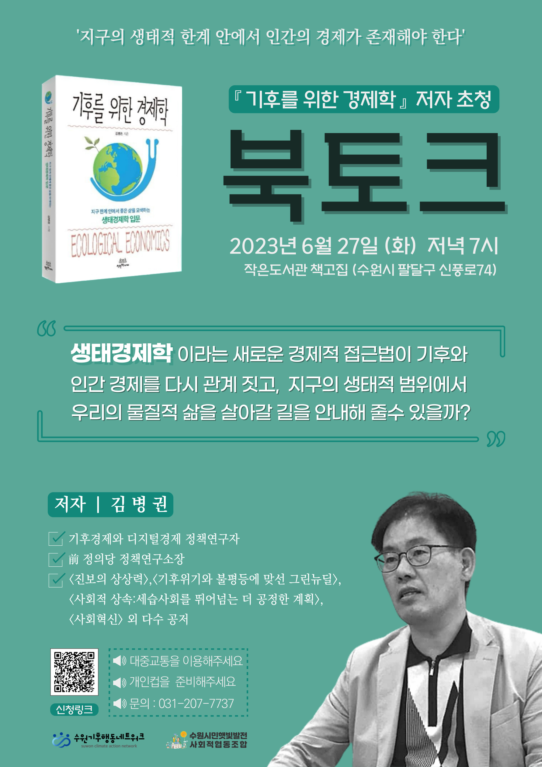 수원기후행동네트워크와 협동조합에서는 6월 맞이 특별 프로그램으로, '기후를 위한 경제학' 김병권 저자와 함께 하는 북토크를 진행합니다.