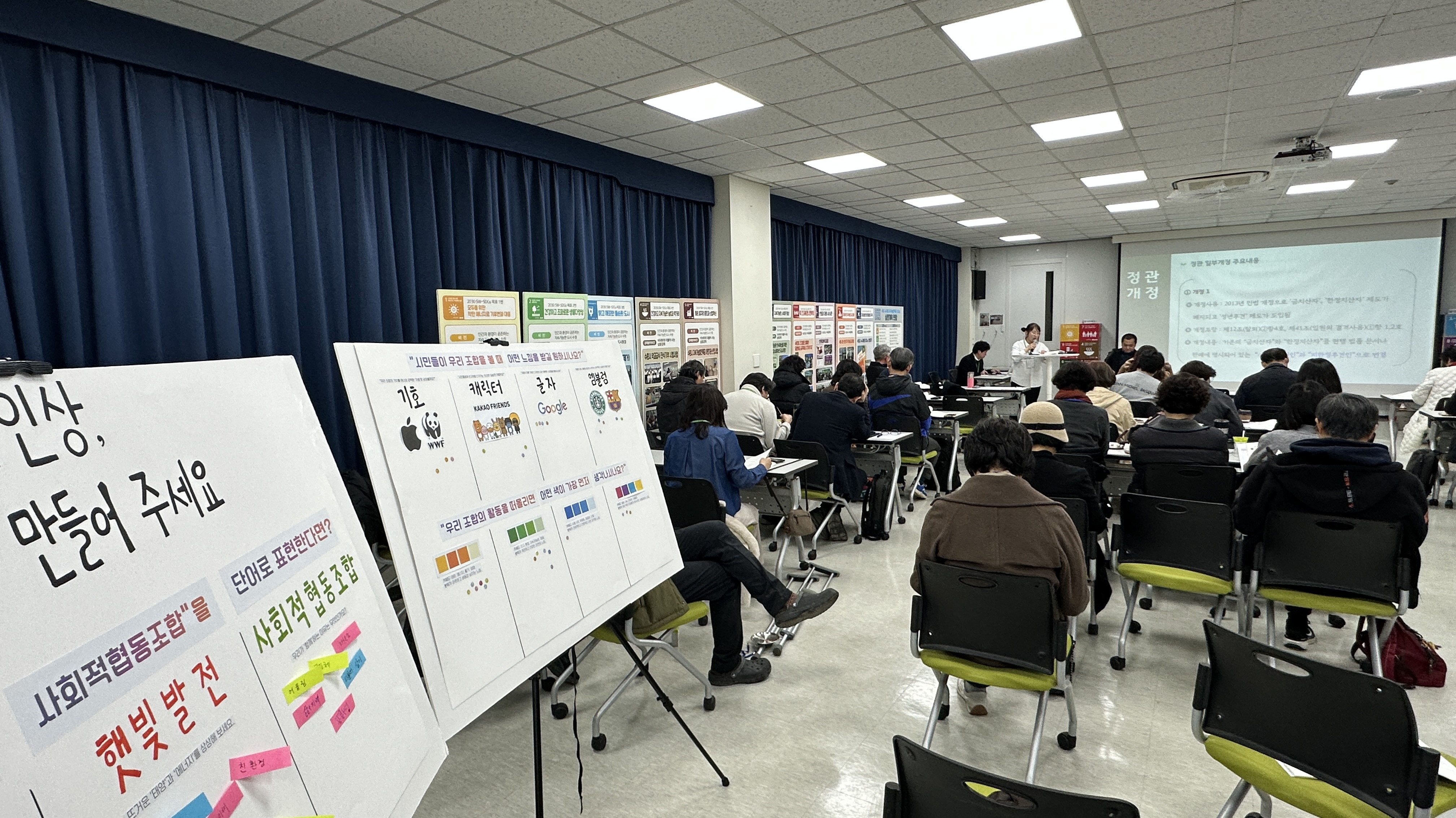 총회장 한쪽에는 우리 조합의 정체성을 담을 CI(로고) 리뉴얼 설문조사 판넬이 세워졌는데요. 새로 오신 임홍규 팀장님의 안내에 따라 많은 분이 어떤 색상과 디자인이 좋을지 정성껏 의견을 주셨습니다. 여러분의 소중한 의견을 담아 조만간 멋진 모습으로 찾아올 새로운 로고도 많이 기대해 주세요!