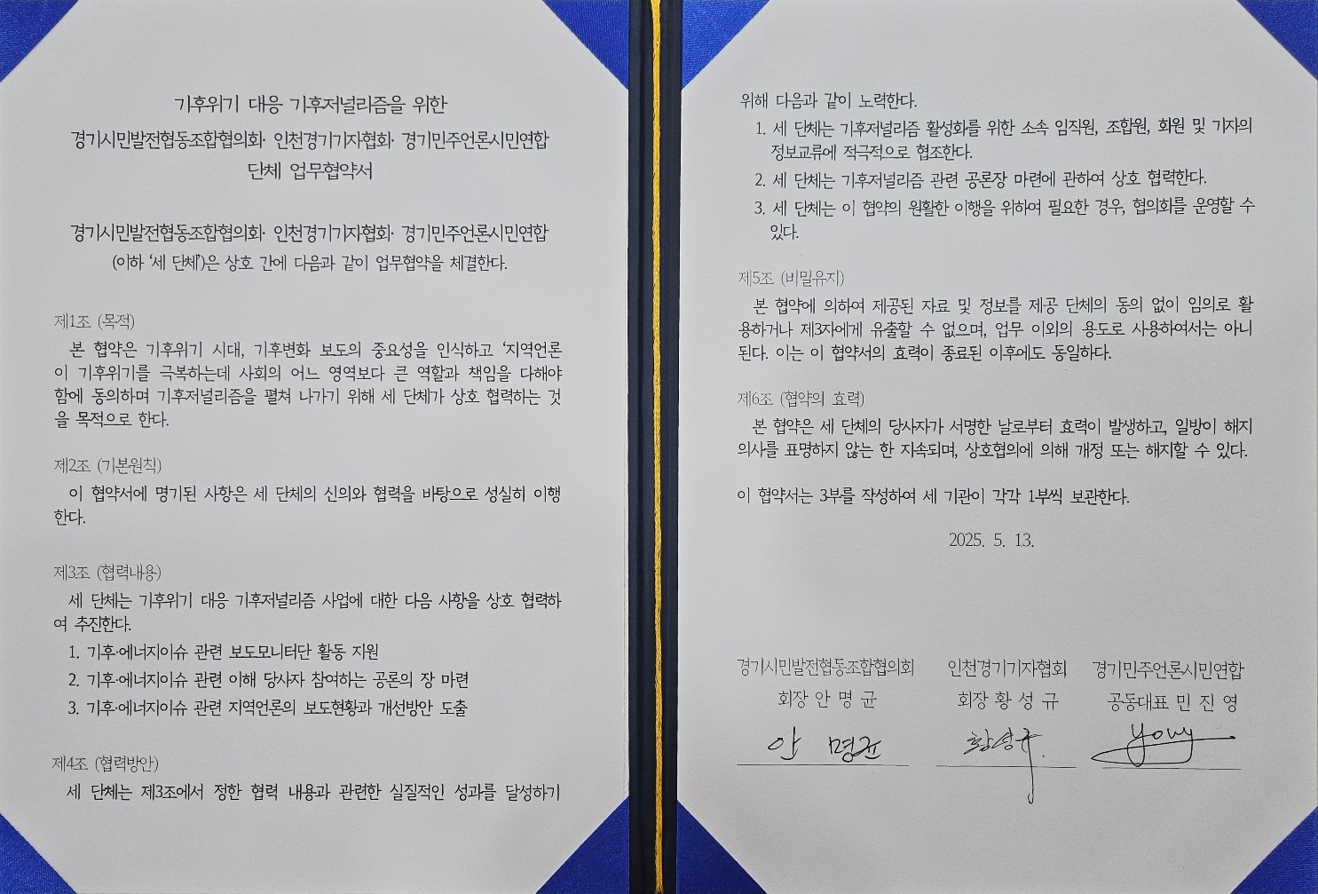 [경기일보] 인천경기기자협회, 시민단체와 기후저널리즘 업무협약 체결
